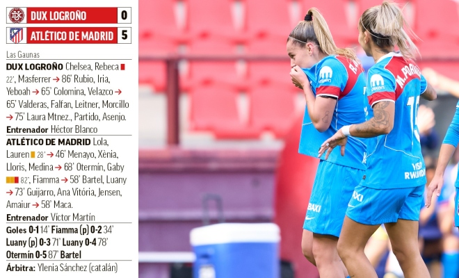 El Atlético de Madrid resolvió su visita a Las Gaunas con una goleada (0-5) ante el DUX Logroño gracias al doblete de Luany y los goles de Fiamma, Otermín y Bartel. Las rojiblancas suman tres puntos y una dosis de confianza antes del choque europeo frente a la Juventus en su estadio.