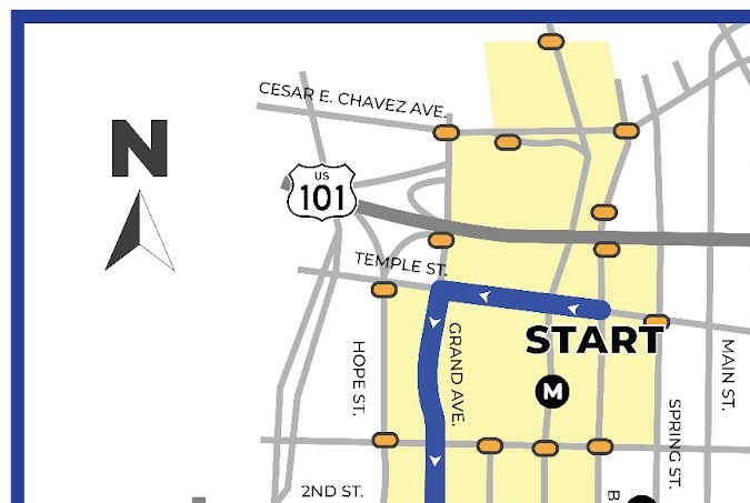 El desfile que se prevé tendrá una duración de 45 minutos y un recorrido de 1.7 millas, comenzará en el cruce de las calles Temple y Broadway; se dirigirá hacia el oeste por la Temple, luego hacia el sur por Grand Avenue, después hacia el oeste por la 7th Street y finalmente hacia el norte por Figueroa Street, para terminar en la 5th Street.